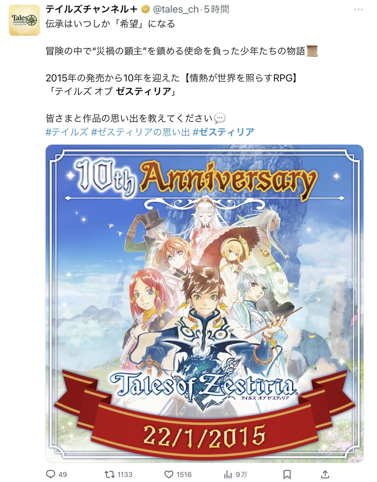 【ん報】「テイルズオブゼスティリア」が10周年❤ 2025/1/23 Y速報 " " 1: 2025/01/22(水) 07:25:00.27 ID:ZfclQa6x0 おめでとう御座います🎉 続きを読む Source: Y速報