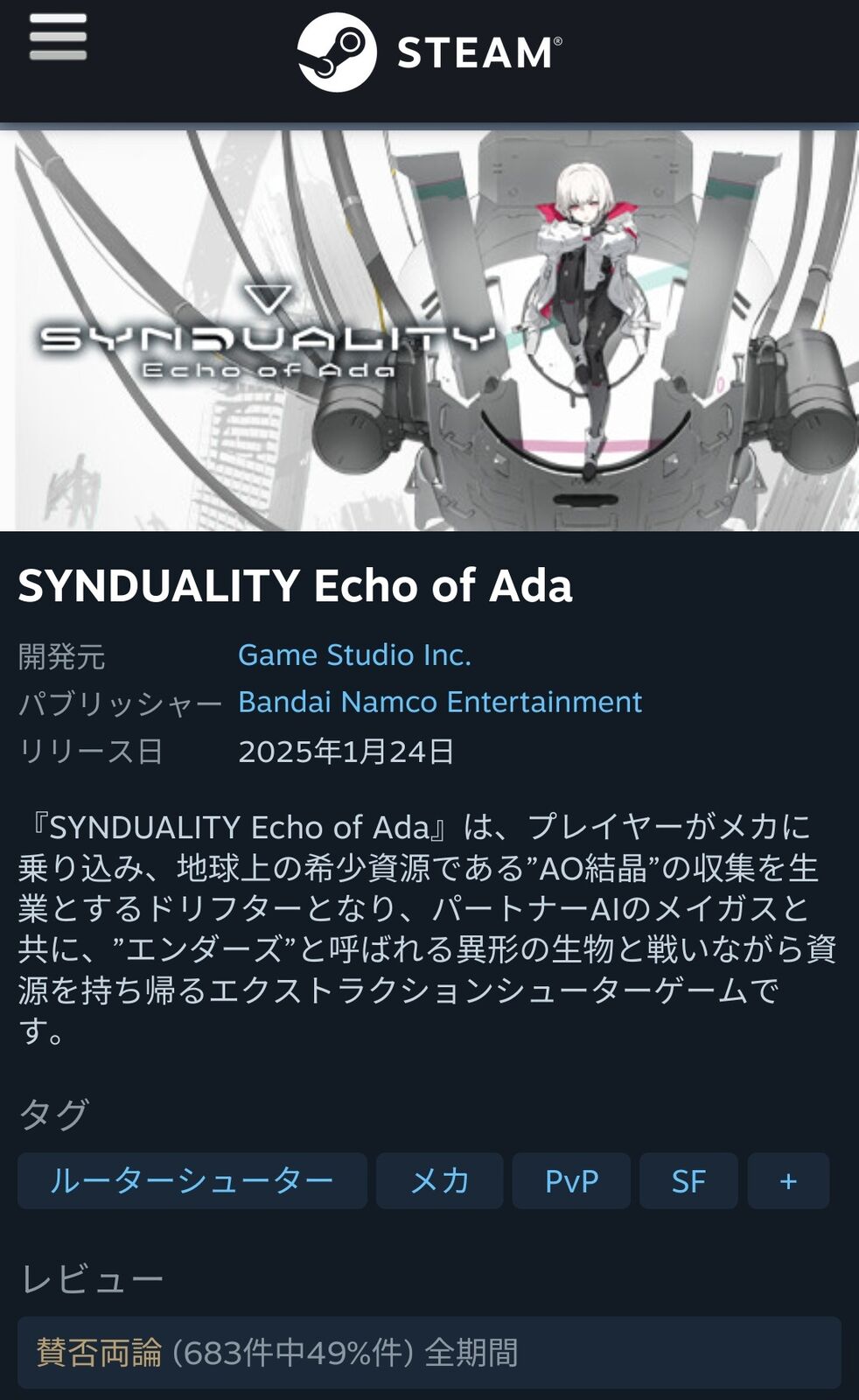 【悲報】State of Playで初公開されたバンナムAAA『SYNDUALITY Echo of Ada』、賛否両論評価 2025/1/23 Y速報 " " 1: 2025/01/23(木) 12:39:54.61 ID:a398/fWa0 デラックス版購入者限定のアーリーアクセス期間にSteamレビュー賛否両論 (683件中49%件) 続きを読む Source: Y速報