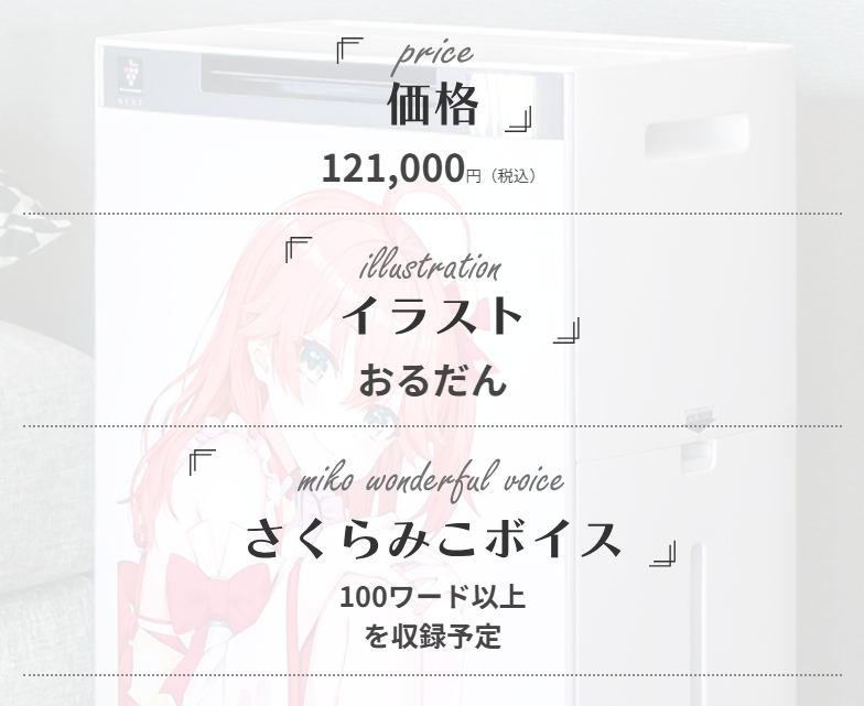 同社の「KI-TX75-W」をベースとした××タムモデル。前面にさくらみこさんのイラストが大きく描かれ、手書きメッセージが印刷されるほか、「“喋る”えりぃと家電」と謳われている通り、100ワード以上のボイスが収録される予定という。