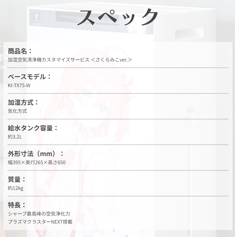 以前のさくらみこさんの配信内で、シャープの加湿空気清浄機に水を投入しないまま加湿機能を使っていたことが判明。それにシャープの公式Xアカウントが反応したことがコラボのきっかけ。当時のやり取りでは「無から水を生み出して加湿できるようにがんばる」としていたが、本コラボモデルにおいても水は入れる必要がある。