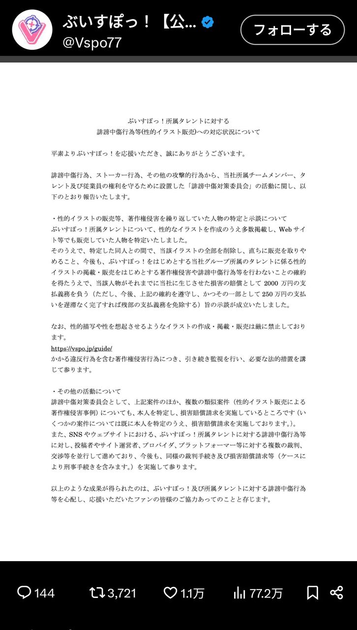 【悲報】ぶいすぽっ!さん、同人誌を販売していた人物を特定して損害賠償を支払わせることに…… 2025/1/28 ゲーム実況者速報 " " 1: ゲーム実況者速報 2025/01/28(火) 20:27:13.306 ID:m9NhYt2R0 やはりVには関わるべきではない😨 続きを読む Source: ゲーム実況者速報