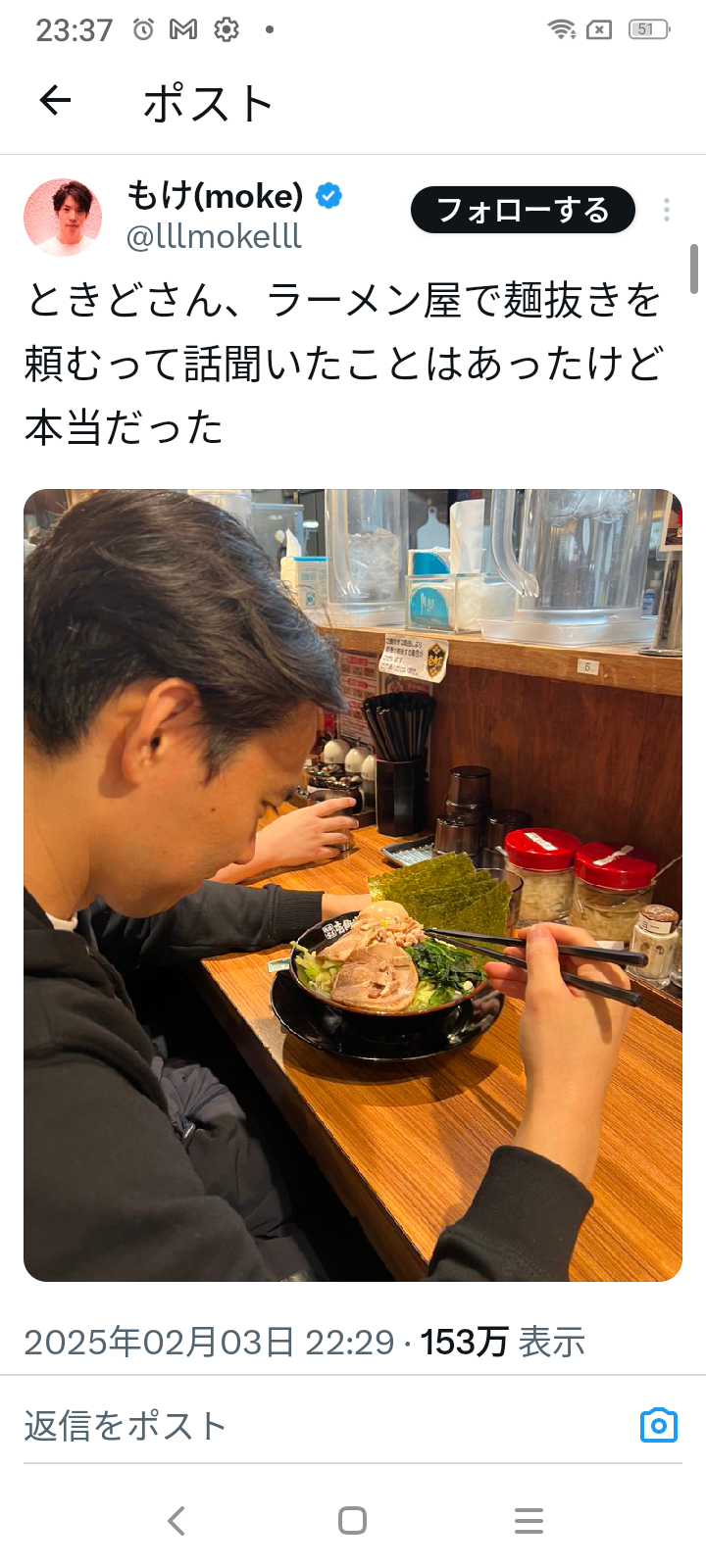 【ヤバすぎ】プロゲーマーときどさん、ラーメン屋で○○○を頼んでしまうwwwwwwwwww 2025/2/6 ゲーム実況者速報 " " 1: ゲーム実況者速報 2025/02/05(水) 16:29:04.820 ID:z5ay5EBa0 麺抜きって出来るんだね 続きを読む Source: ゲーム実況者速報