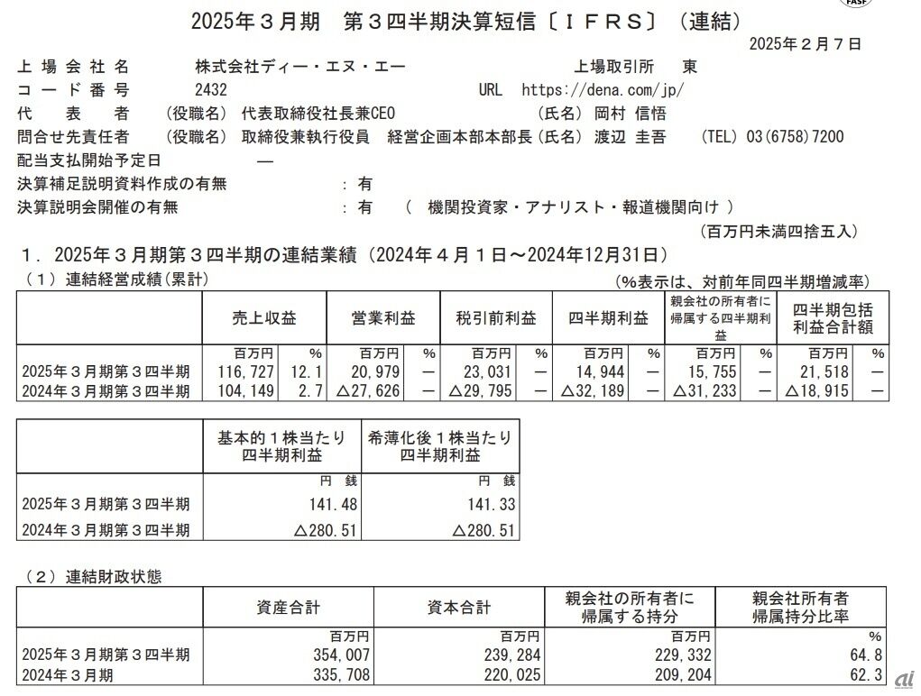 ディー・エヌ・エー(DeNA)は2月7日、2025年3月期 第3四半期 決算を発表した。
