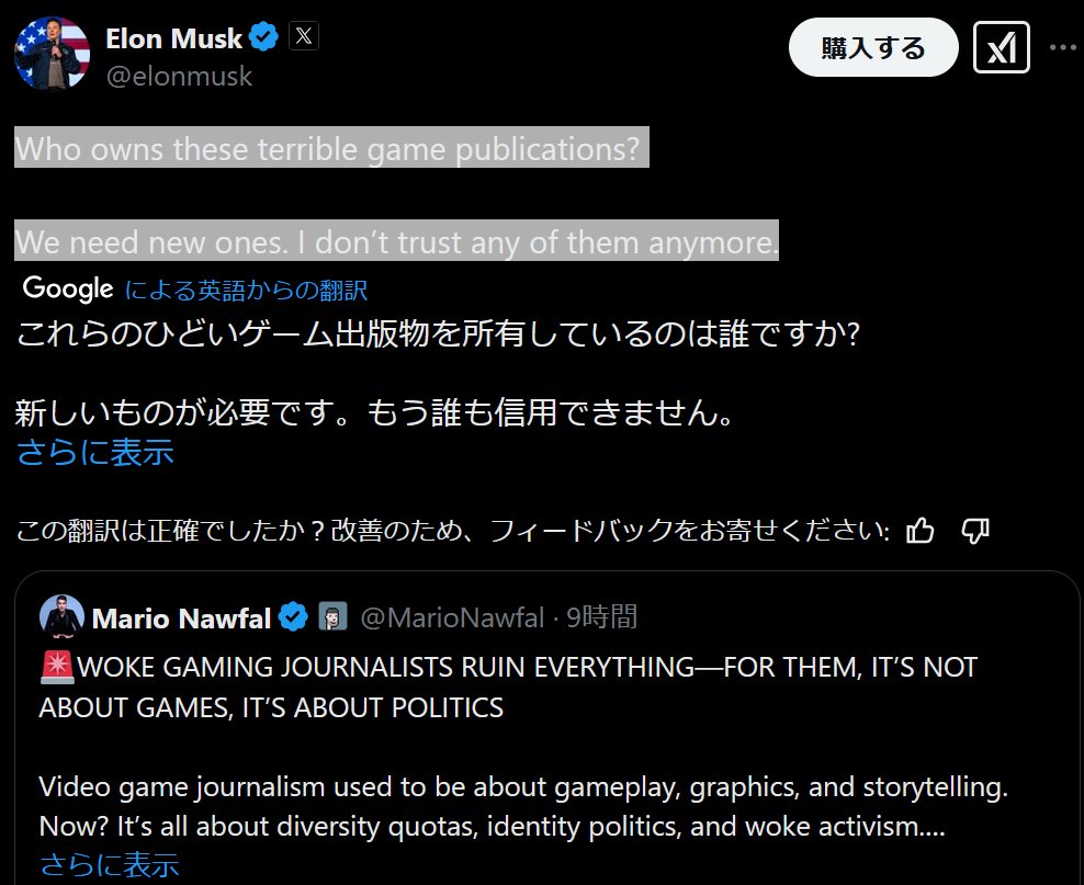 【朗報】イーロンマスクお目覚めゲームにお気持ち表明「新しいものが必要です」 2025/2/10 Y速報 " " 1: 2025/02/10(月) 07:54:22.57 ID:jLkV7MA70 Who owns these terrible game publications? We need new ones. I don’t trust any of them anymore. スクショ 続きを読む Source: Y速報