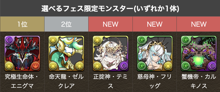 【1回限り】ゼルクレア、エニグマ、新フェス限×3の配布開始キタ━(゚∀゚)━!!【パズドラ】 2025/2/18 オーガch.-パズドラ攻略まとめ速報 " " 期間:02/18(火)12:00~2/28(金)23:59 5フロアの中から、欲しいフェス限定モンスターの登場するフロアを1つ選択! フロアをクリアすると、選んだフェス限定モンスターをゲットできるぞ! 2月初旬に実施したアンケートの人気1位、2位か、「正掟神・テミス」などの新フェス限定モンスター3体の中から、欲しいモンスターが出現するフロアを選ぼう! 続きを読む Source: オーガch.-パズドラ攻略まとめ速報