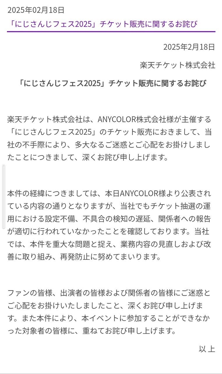 【ドン引き】大手Vグループのライブで問題の楽天チケットさん、ヤバすぎる謝罪文を公開してしまう…… 2025/2/19 ゲーム実況者速報 " " 1: ゲーム実況者速報 2025/02/18(火) 22:40:16.948 ID:5yNkt3dx0 大丈夫か? 続きを読む Source: ゲーム実況者速報