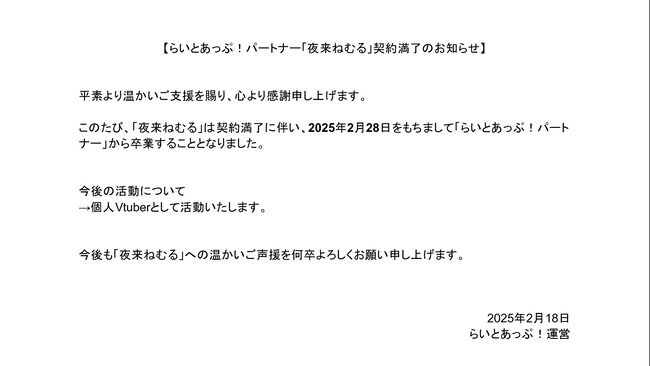 「夜来ねむる」契約満了のお知らせ pic.twitter.com/qgvwGPON36— らいとあっぷ!公式 (@Lightup_app) February 18, 2025