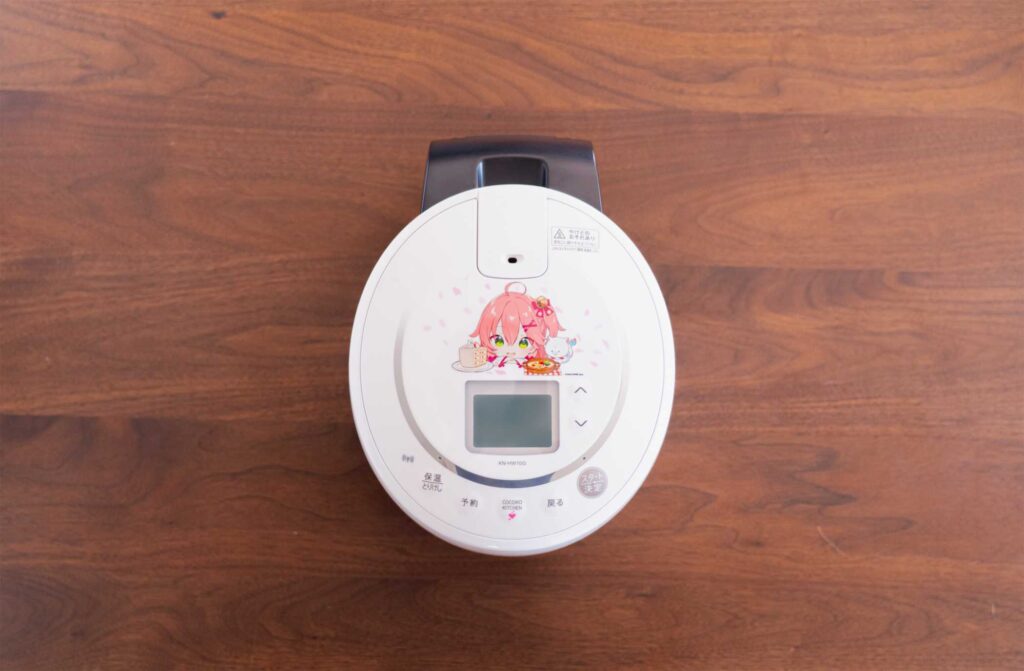そして、加湿空気清浄機に加えて、新たな××タマイズサービスとして同社のホットクックでのコラボも決定。こちらもさくらみこさんからの手書きメッセージが刻印されており、ボイスも空気清浄機と同内容のものを100ワード収録。イラストは木屋町氏によるSDキャラが描かれている。価格は71,500円。