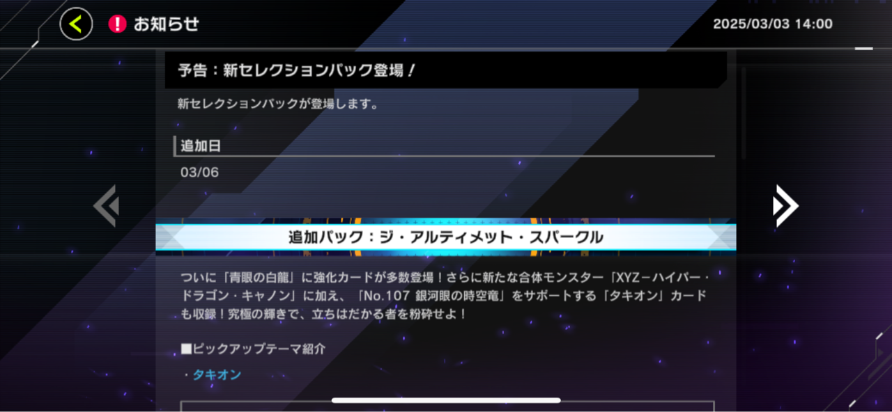 【速報】新パック「ジ・アルティメット・スパークル」を3/6実装 「タキオン」きたあああ!!! 2025/3/3 遊戯王デュエルリンクス超速報! " " 続きを読む Source: 遊戯王デュエルリンクス超速報!