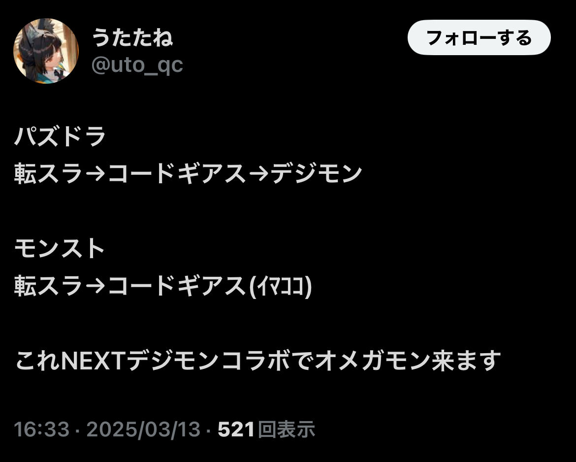 【衝撃】モンスト、次はデジモンコラボでオメガモン来ますwwwwwww【パズドラ】 2025/3/13 オーガch.-パズドラ攻略まとめ速報 " " 32: おーがちゃんねる 2025/03/13(木) 18:01:33.32 モンストの次の新規コラボはデジモンです 続きを読む Source: オーガch.-パズドラ攻略まとめ速報