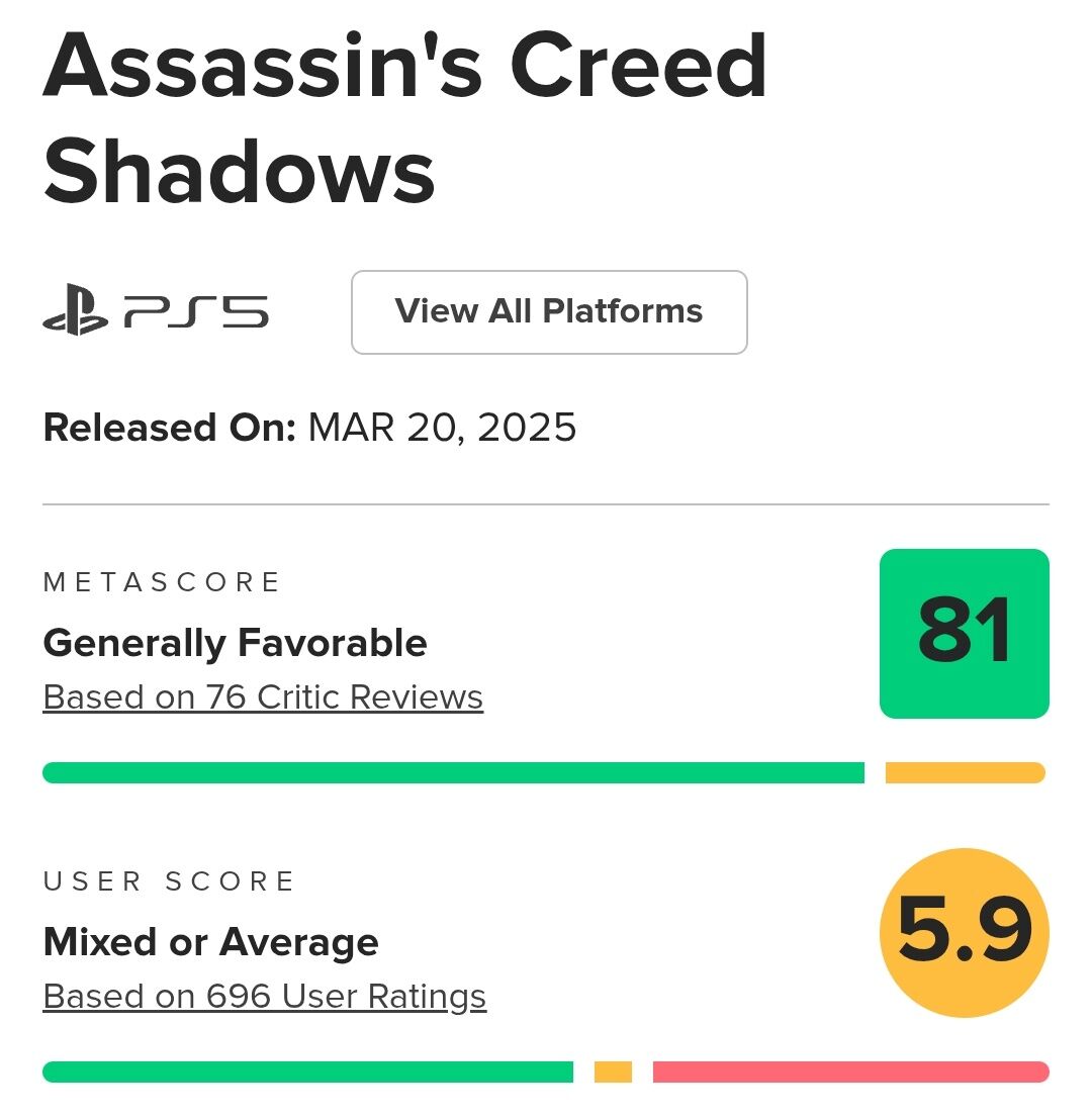 【悲報】アサシンクリード シャドウズ、Metacriticユーザースコア5.9 2025/3/23 Y速報 " " 1: 2025/03/22(土) 15:09:55.80 ID:GVoazfuF0 偽弥助シミュレーターさん… 続きを読む Source: Y速報