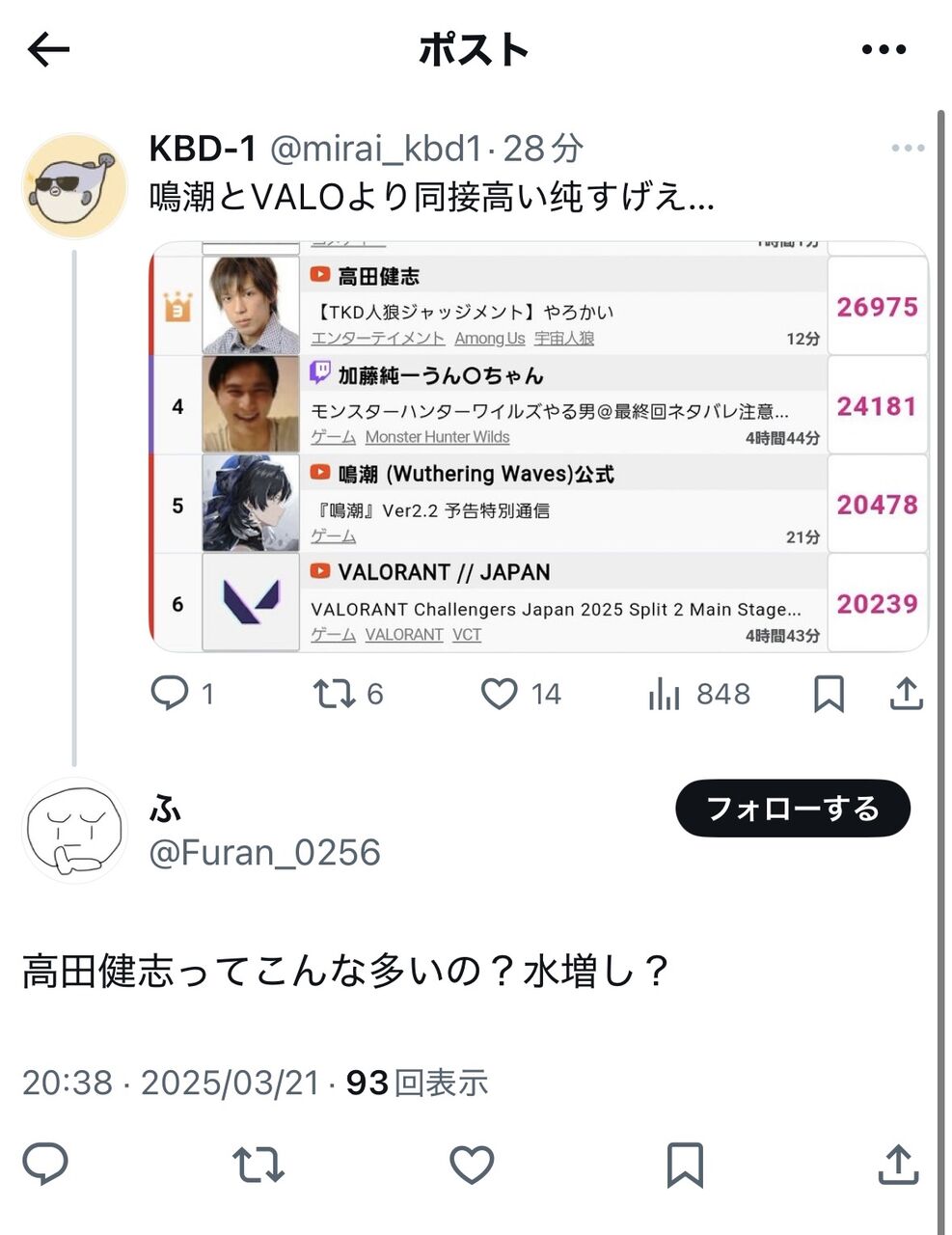 【爆笑】蛆豚、高田健志が加藤純一以上の同接を出してしまい水増しだと叩くwwww 2025/3/23 ゲーム実況者速報 " " 850: ゲーム実況者速報 2025/03/21(金) 20:47:36 ID:Zf0NSETY00 意地でも負けを認めたくない🐛クカ 続きを読む Source: ゲーム実況者速報
