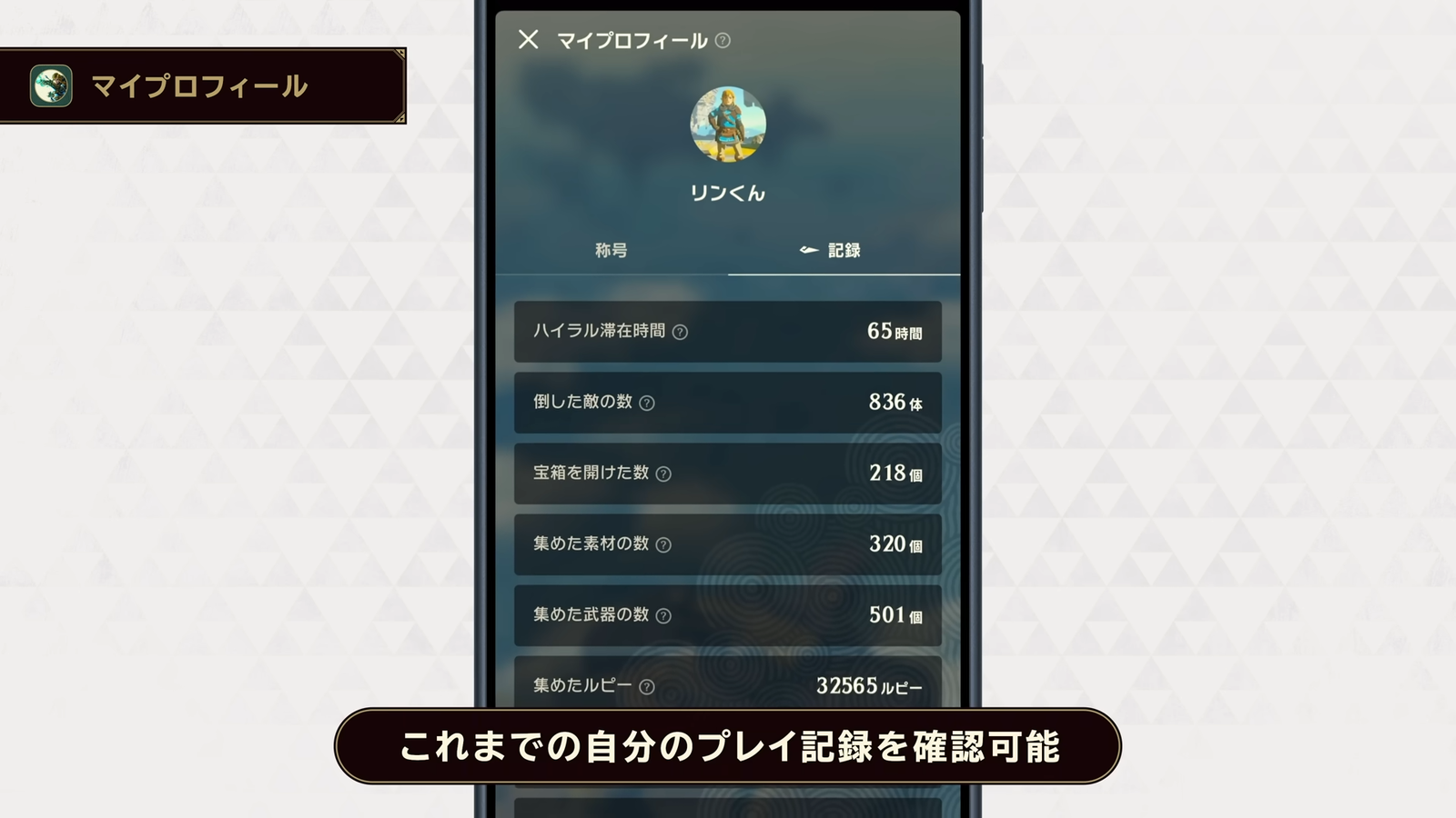 「記録」では倒した敵の数や宝箱を開けた数など、ゲーム中のプレイヤーに関する数々のデータを閲覧できる。そのプレイ記録に応じて、様々な「称号」を獲得できる。称号には移動した総距離に対応したものや、集めたルピーの合計など、プレイヤーのチャレンジ精神を促すものになっている。