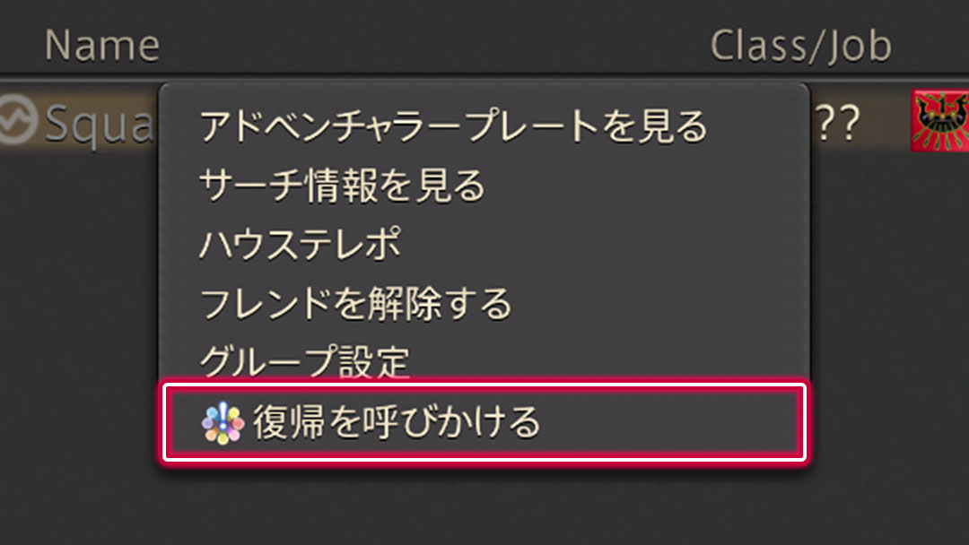 ゲーム内のフレンドリストまたはフリーカンパニーメンバーリストから、オフラインステータスになっている相手を選択し、サブコマンドから「復帰を呼びかける」を行う。