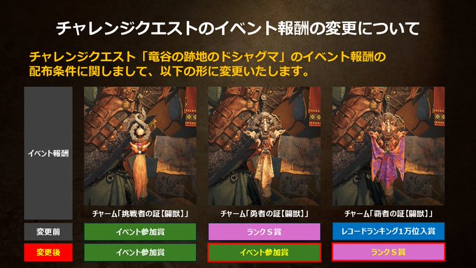 現在開催中のチャレンジクエスト「竜谷の跡地のドシャグマ」のイベント報酬に関しましては、不正行為および不具合により、健全なランキングをご提供できていない状況を鑑みて、添付の形に変更いたします。