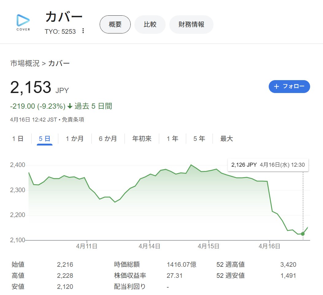 Vtuber世界一登録者数のがうる・ぐら卒業発表警戒で株価-9,59%の暴落#ぐら卒業 pic.twitter.com/ZMzNWDaw5X— 弐号機 (@NigokiP) April 16, 2025