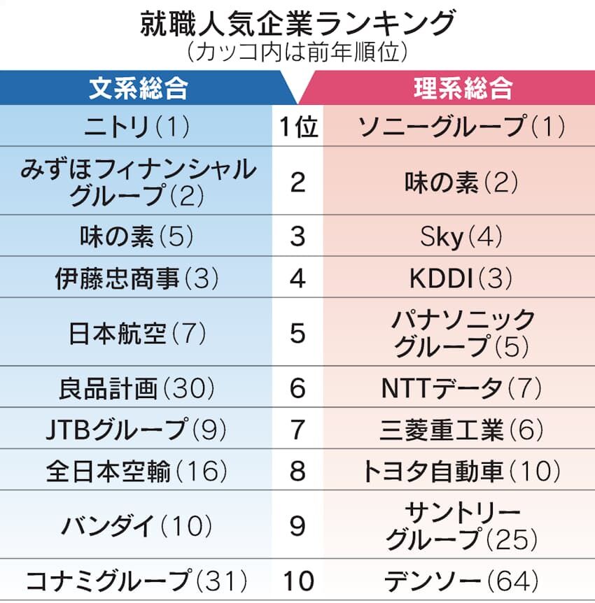 26年卒の就職人気ランキング、ニトリ・ソニーG首位
