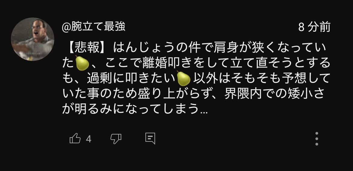 蛆豚さん、今回のはんじょうの炎上で梨民の肩身が狭くなっていると謎の主張を繰り出す 2025/4/27 ゲーム実況者速報 " " 690: ゲーム実況者速報 2025/04/26(土) 09:19:06 ID:hAfjQSz200 オリジナルの切り抜きについてたコメントいわく、どうやら🍐とかいう果物集団野郎共はミニカツ叩かれて萎縮してたらしいな 続きを読む Source: ゲーム実況者速報