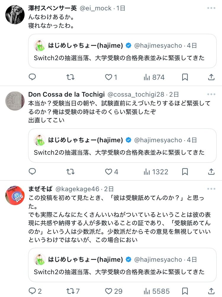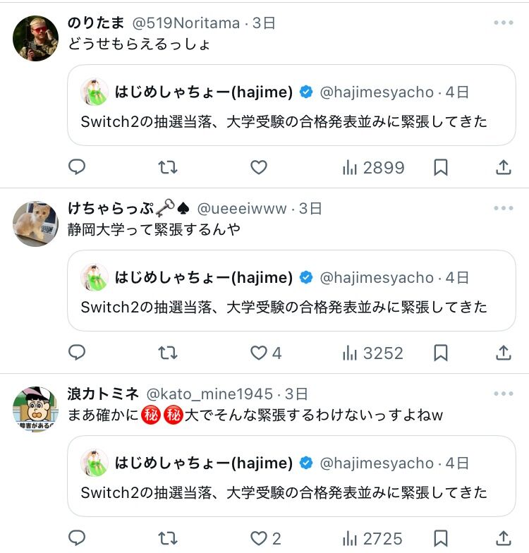 【悲報】はじめしゃちょー「スイッチ2の抽選、大学の合格発表並に緊張してきた!」→大炎上wwwwwwwwww 2025/4/29 ゲーム実況者速報 " " 1: ゲーム実況者速報 2025/04/28(月) 15:02:24.99 ID:2Dd0zL7S0 あ 続きを読む Source: ゲーム実況者速報