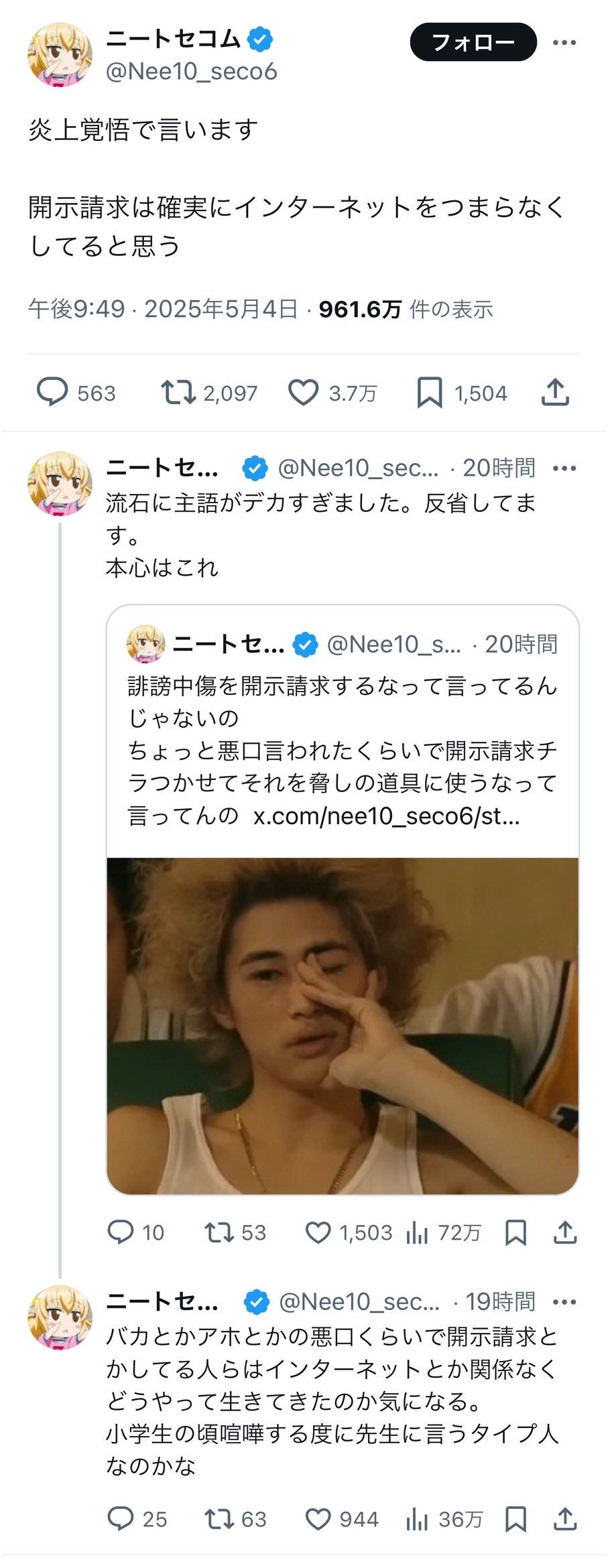 【物議】X民「開示請求のせいで確実にインターネットはつまらなくなった」→とんでもない論争に発展してしまう事態に…… 2025/5/6 ゲーム実況者速報 " " 1: ゲーム実況者速報 2025/05/06(火) 14:18:44.30 ID:uRWQLiD50 うへ 炎上覚悟で言います 開示請求は確実にインターネットをつまらなくしてると思う — ニートセコム (@Nee10_seco6) May 4, 2025 続きを読む Source: ゲーム実況者速報