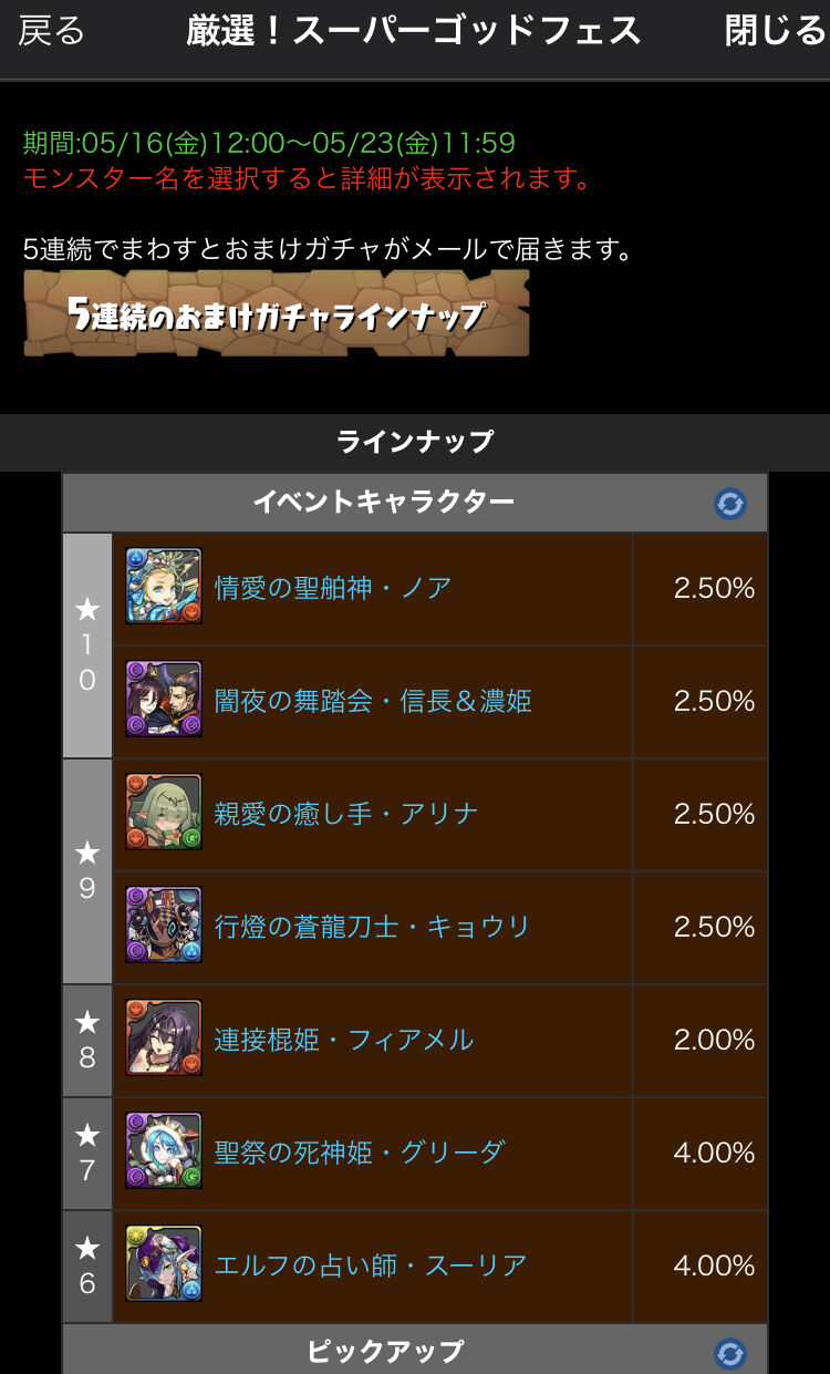 【パズドラ】ピックアップ合計50%!厳選スーパーゴッドフェス開幕キタ━(゚∀゚)━!! 2025/5/16 オーガch.-パズドラ攻略まとめ速報 " " 期間:05/16(金)メンテナンス後~05/23(金)11:59 魔法石10個で1回まわすことができる「厳選!スーパーゴッドフェス」が開催! 季節イベントのモンスターや、フェス限定モンスターなどがラインナップ! また、5連続のおまけガチャには「ゼウスのアバたま」「ヘラのアバたま」などがラインナップ! さらに、期間限定のガチャセットも販売するぞ! 続きを読む Source: オーガch.-パズドラ攻略まとめ速報