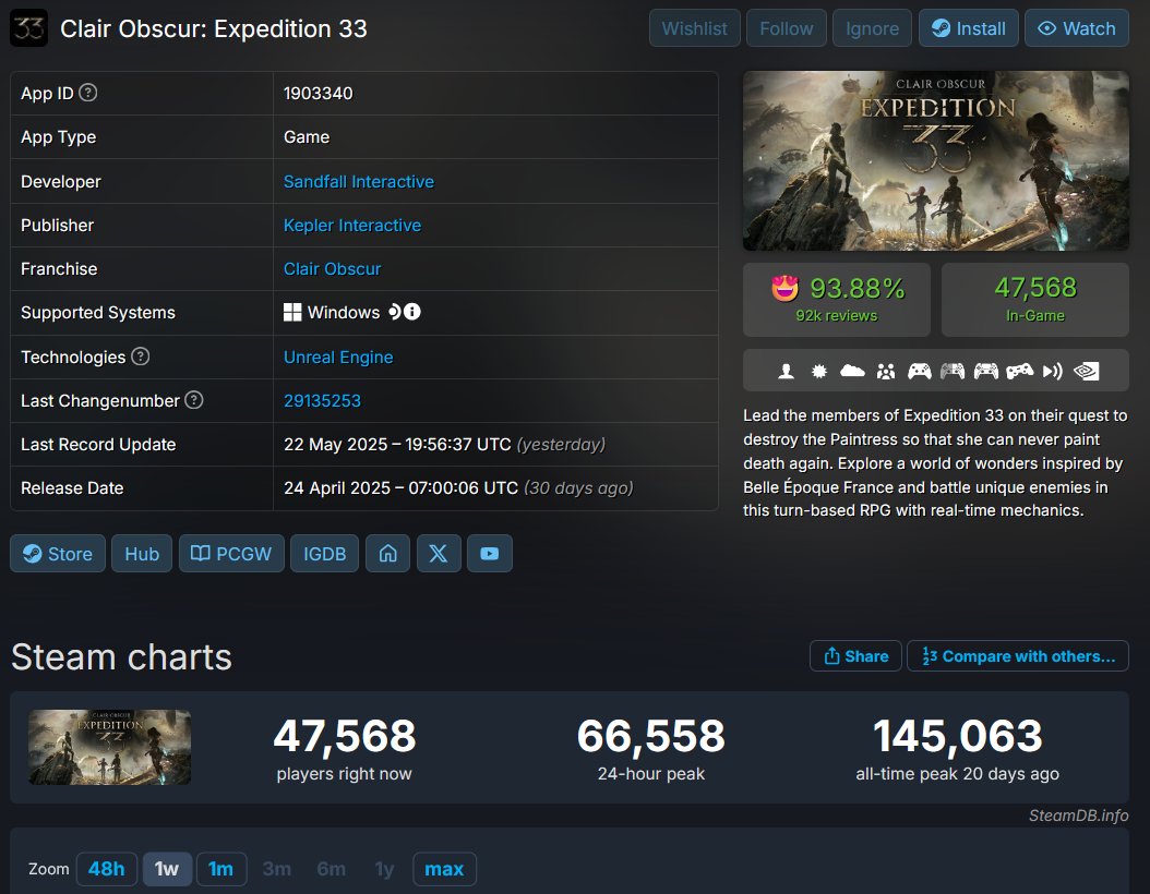 「Clair Obscur: Expedition 33」発売1カ月経つもSteam同接6万越え 2025/5/25 Y速報 " " 1: 2025/05/24(土) 13:30:57.71 ID:h89YIofc0 好評93.88% https://steamdb.info/app/1903340/charts/ 続きを読む Source: Y速報