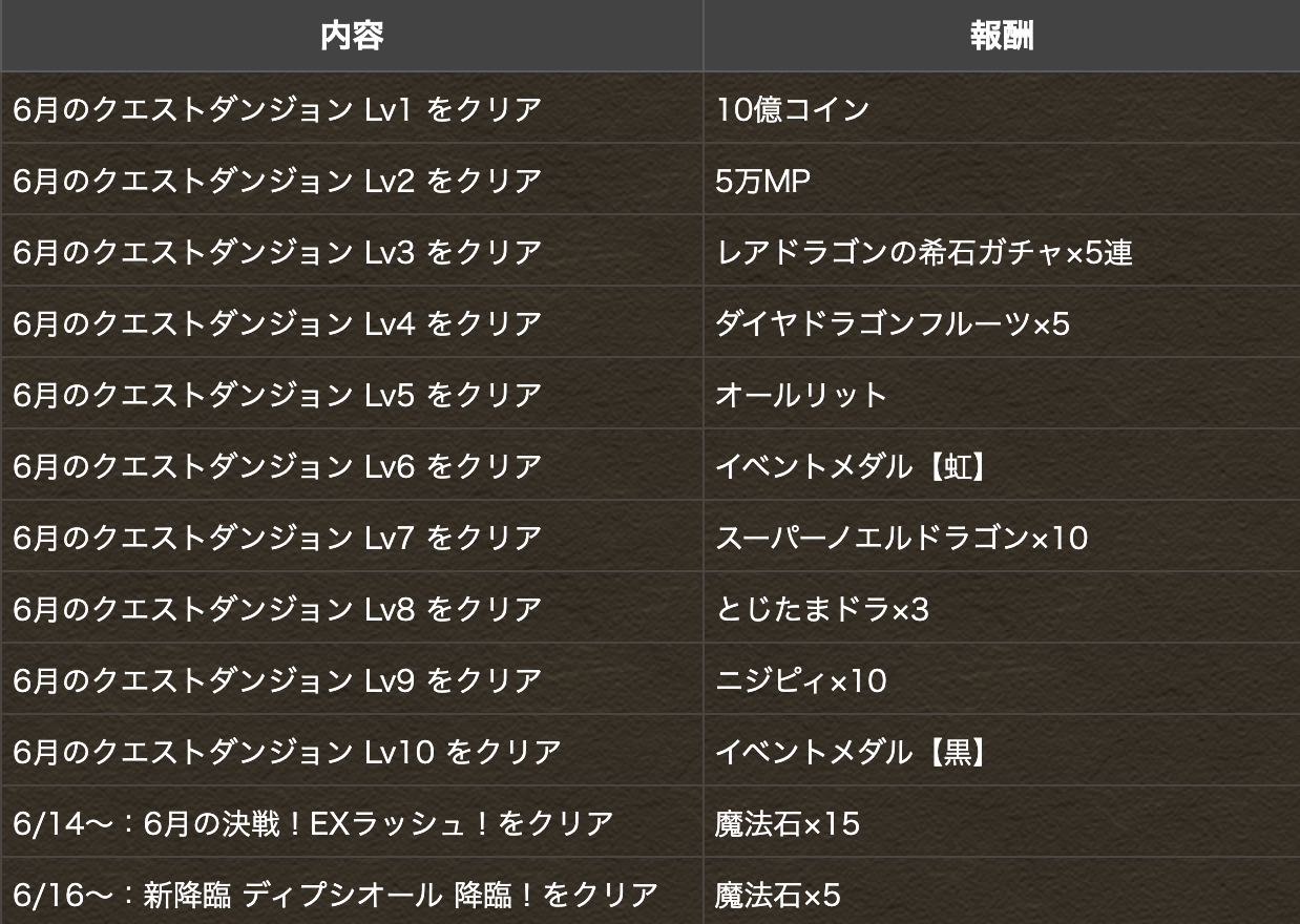 【パズドラ】6月クエスト開幕!気になる難易度とは【情報求む】 2025/6/1 オーガch.-パズドラ攻略まとめ速報 " " 「6月のクエスト」開催! 期間:06/01(日)00:00~06/30(月)23:59 クエストをクリアして、報酬をゲットしよう! クエストレベル報酬とクエスト報酬で、合計120個の魔法石をゲットできるぞ! クエストレベル報酬 クエストレベル1ごとに「魔法石 5個」、最大レベル20で合計魔法石 100個ゲット! 続きを読む Source: オーガch.-パズドラ攻略まとめ速報