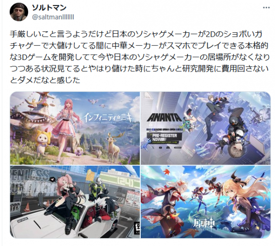 【悲報】国産ソシャゲ、中国に完全敗北する「2Dのガチャゲーしか作ってこなかった日本は居場所ない」 2025/6/1 Y速報 " " 1: 2025/05/29(木) 17:46:11.14 ID:vu2/JPTd0NIKU 続きを読む Source: Y速報