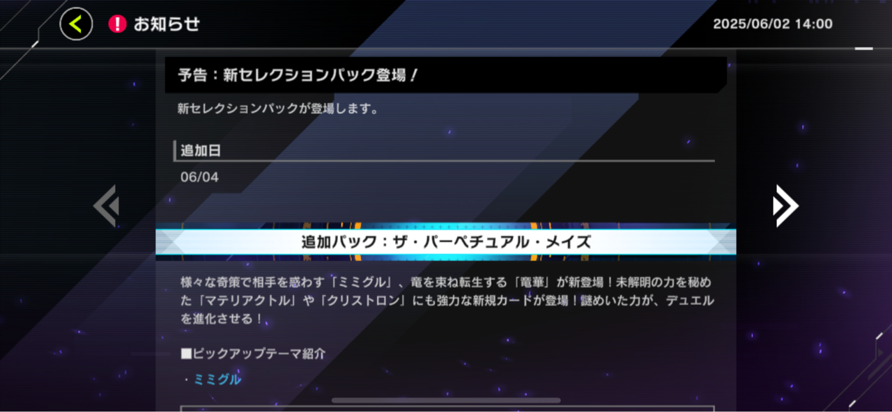 【速報】新パック「ザ・パーペチュアル・メイズ」を6/4追加 「ミミグル」きたあああ!!! 2025/6/2 遊戯王デュエルリンクス超速報! " " 続きを読む Source: 遊戯王デュエルリンクス超速報!
