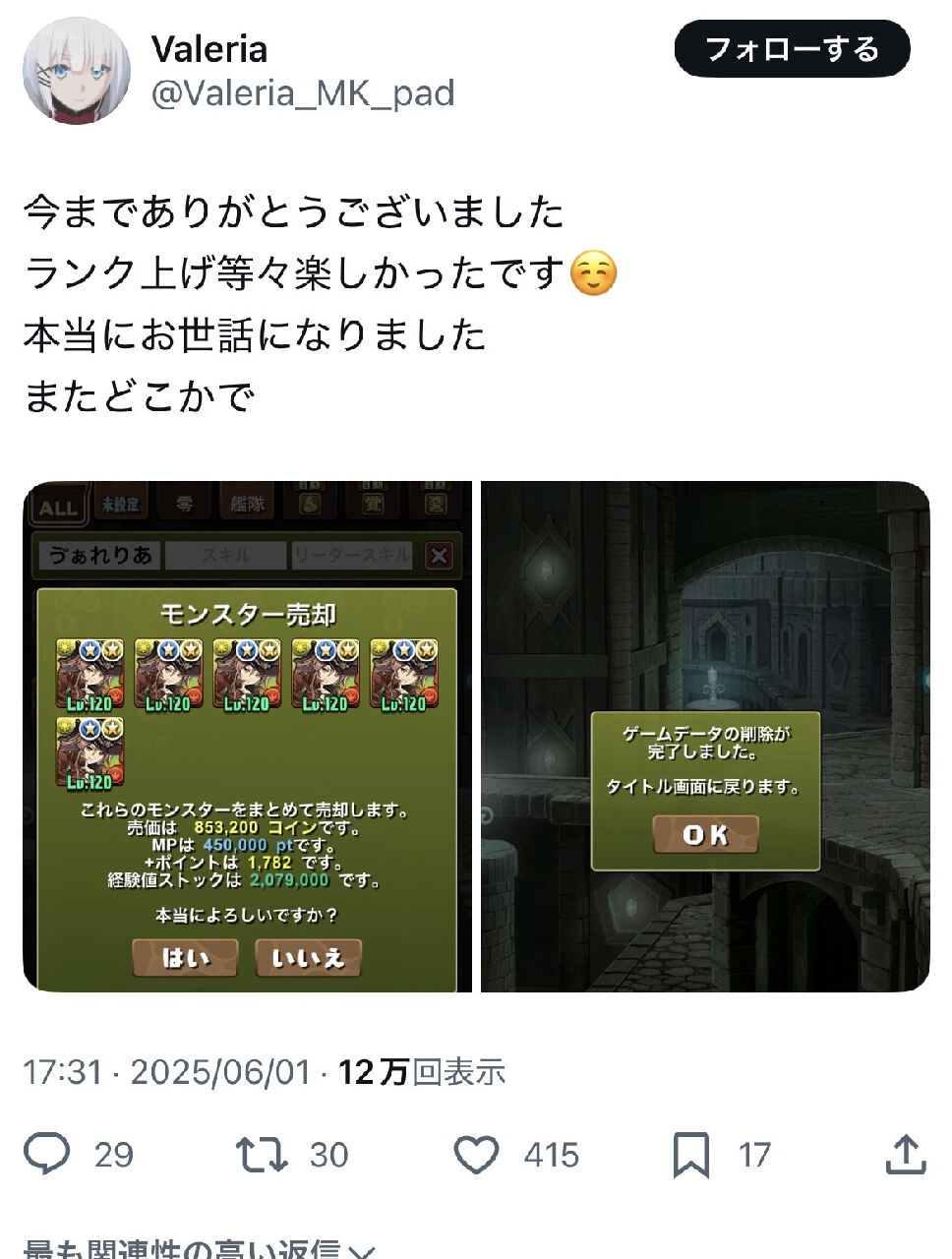 【パズドラ】1700ランカーが旅立ちました 2025/6/3 オーガch.-パズドラ攻略まとめ速報 " " 742: おーがちゃんねる 2025/06/02(月) 15:09:56.43 1700ランカーが旅立ちました 続きを読む Source: オーガch.-パズドラ攻略まとめ速報