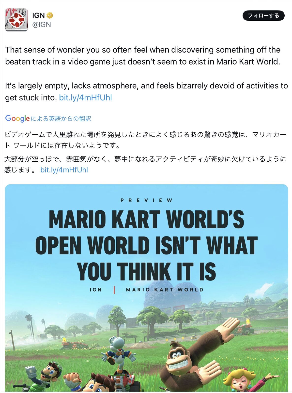 【悲報】大手ゲームメディア、新作マリオカート ワールドを酷評 2025/6/4 Y速報 " " 1: 2025/06/04(水) 12:49:08.30 ID:csL+U4Eg0 ビデオゲームで人里離れた場所を発見したときによく感じるあの驚きは、『マリオカート ワールド』には全く感じられない。 ほとんど何もなく、雰囲気もなく、夢中になれるアクティビティが奇妙なほど欠けているように感じる。 続きを読む Source: Y速報