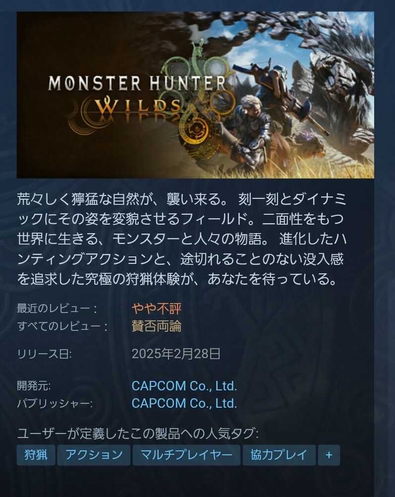 【悲報】モンハンワイルズ、レビューが「やや不評」に落ちる・・・ 2025/6/4 Y速報 " " 1: 2025/06/04(水) 14:49:34.77 ID:y08p4OPT0 https://store.steampowered.com/app/2246340/Monster_Hunter_Wilds/ 続きを読む Source: Y速報