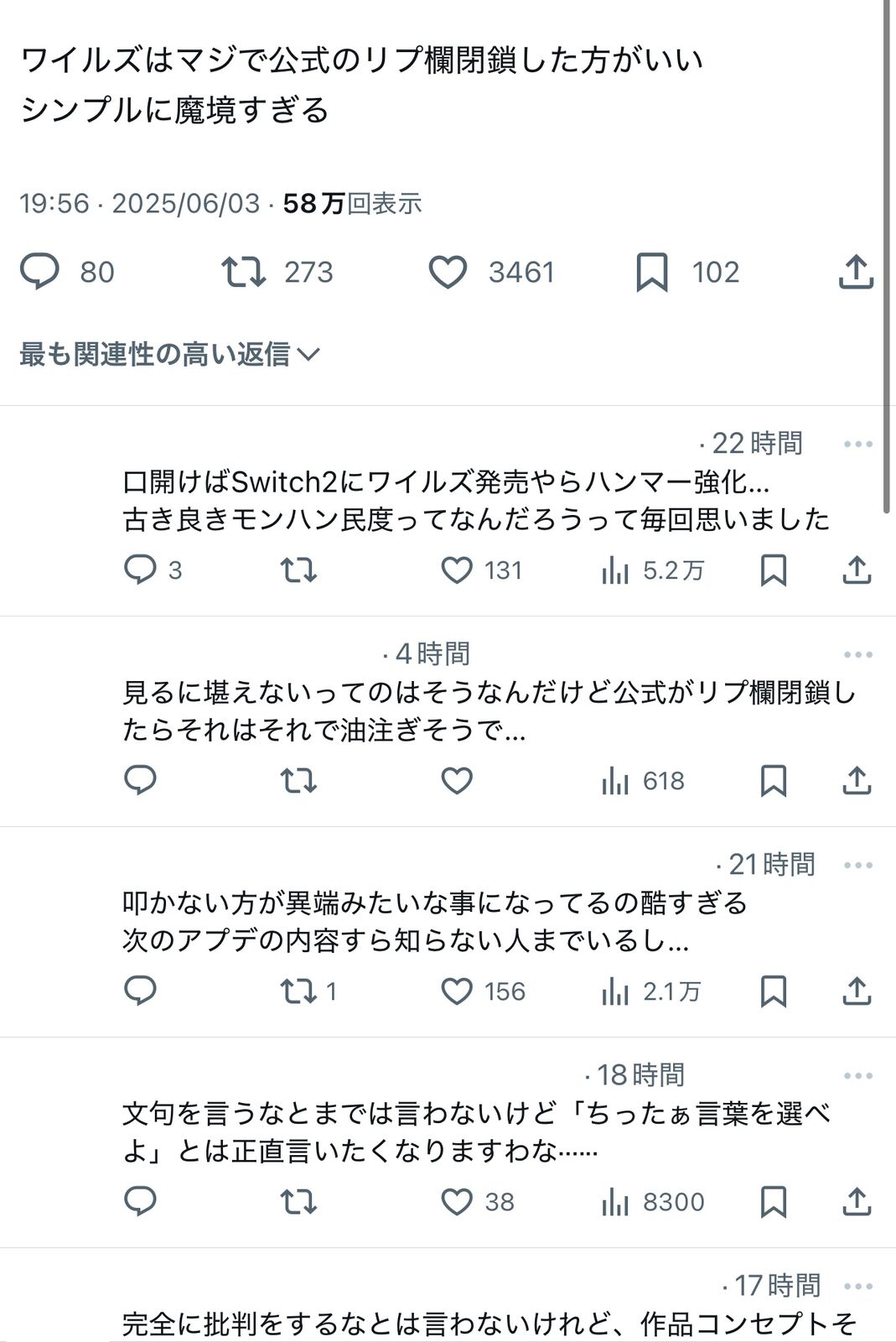 【悲報】モンハンワイルズアンチさん、モンハンファンに苦言を呈されてしまう 2025/6/5 Y速報 " " 1: 2025/06/04(水) 18:18:01.01 ID:UUb3t1c90 口が悪すぎ!批判するにしても言葉を選んでください! 続きを読む Source: Y速報