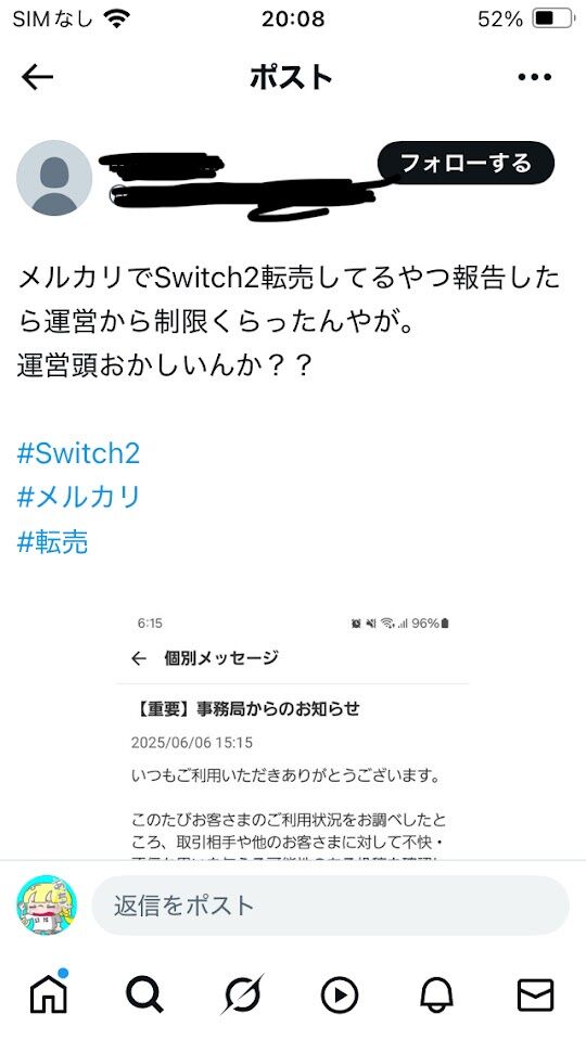 メルカリ、「Switch2の転売ヤーを通報した人」をBANしてしまう 2025/6/9 Y速報 " " 1: 2025/06/08(日) 15:33:02.12 ID:wUEuSbVc0 転売ヤーに不快な思いをさせたのでBAN 続きを読む Source: Y速報