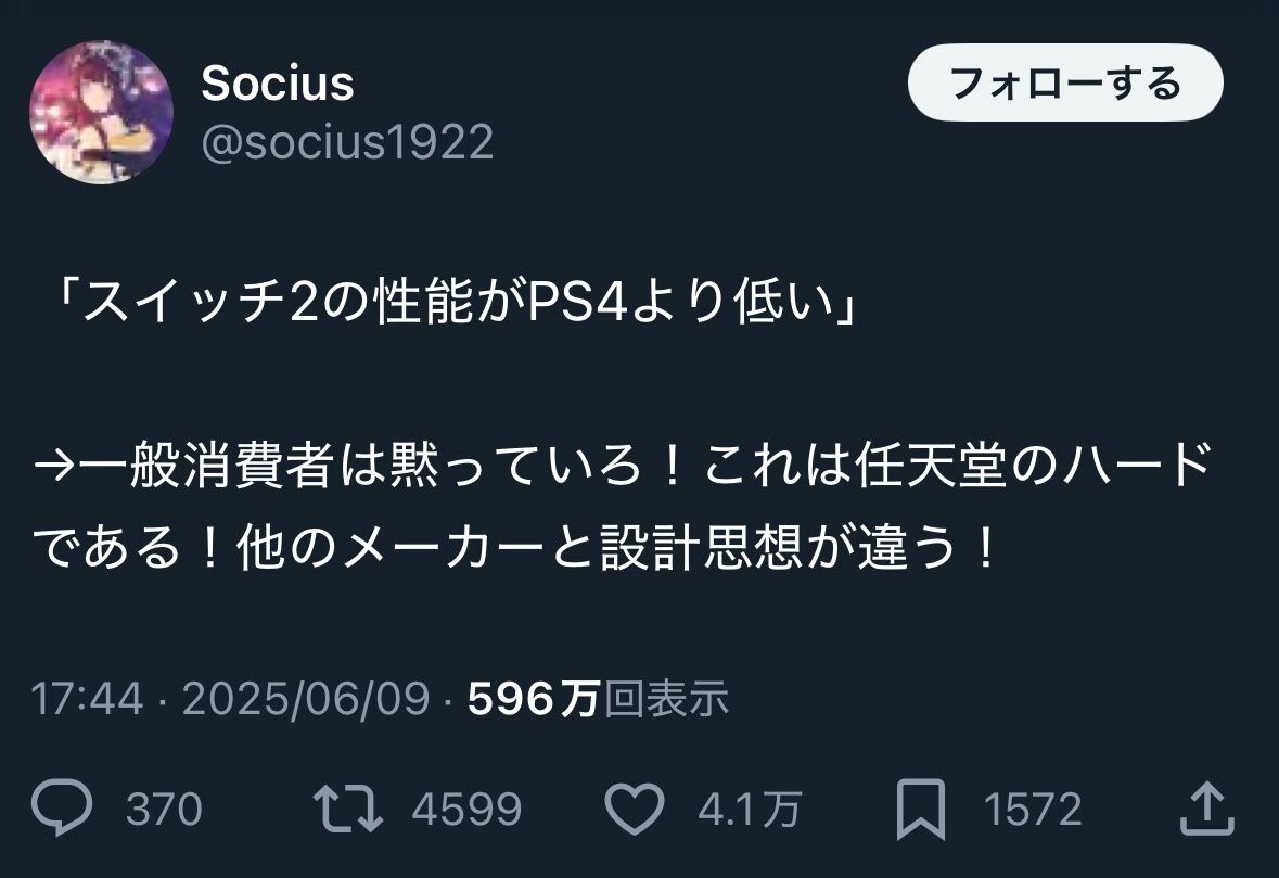 「スイッチ2の性能がPS4より低い」→一般消費者は黙ってろ!これは任天堂のハードである!他のメーカーとは設計思想が違う! 2025/6/11 ゲーム実況者速報 " " 1: ゲーム実況者速報 2025/06/10(火) 16:19:41.25 ID:5T94Ry820 いいかゴキブリ 続きを読む Source: ゲーム実況者速報