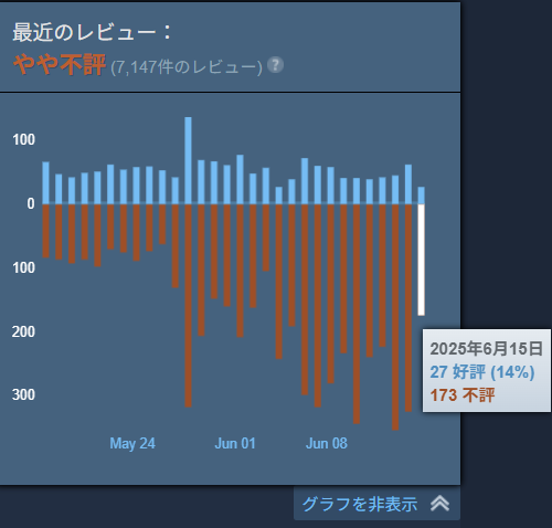 このままだと最近のレビュー評価が「やや不評」から「圧倒的に不評」へ
