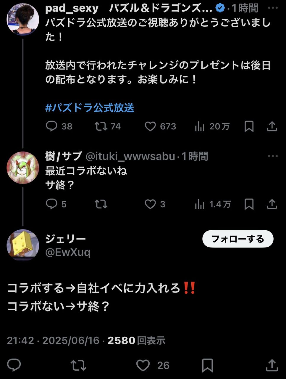 【悲報】パズドラアンチ君、無敵になるwwww 2025/6/17 オーガch.-パズドラ攻略まとめ速報 " " 3: おーがちゃんねる 2025/06/16(月) 23:18:43.61 コレだからパズドラアンチ君はさぁ…. 続きを読む Source: オーガch.-パズドラ攻略まとめ速報