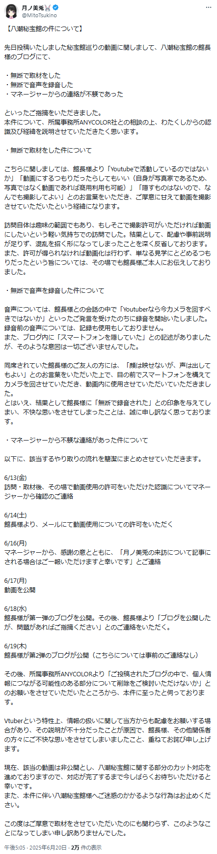 【炎上】大人気Vチューバーさん、秘宝館無断取材の経緯を説明する マネージャーからの連絡が事の発端か…… 2025/6/20 ゲーム実況者速報 " " 1: ゲーム実況者速報 2025/06/20(金) 18:15:14.314 ID:MLYwPqfCd 続きを読む Source: ゲーム実況者速報
