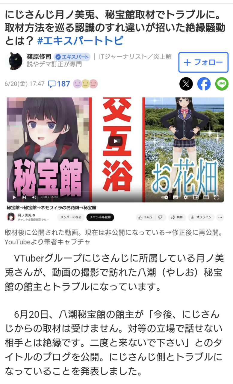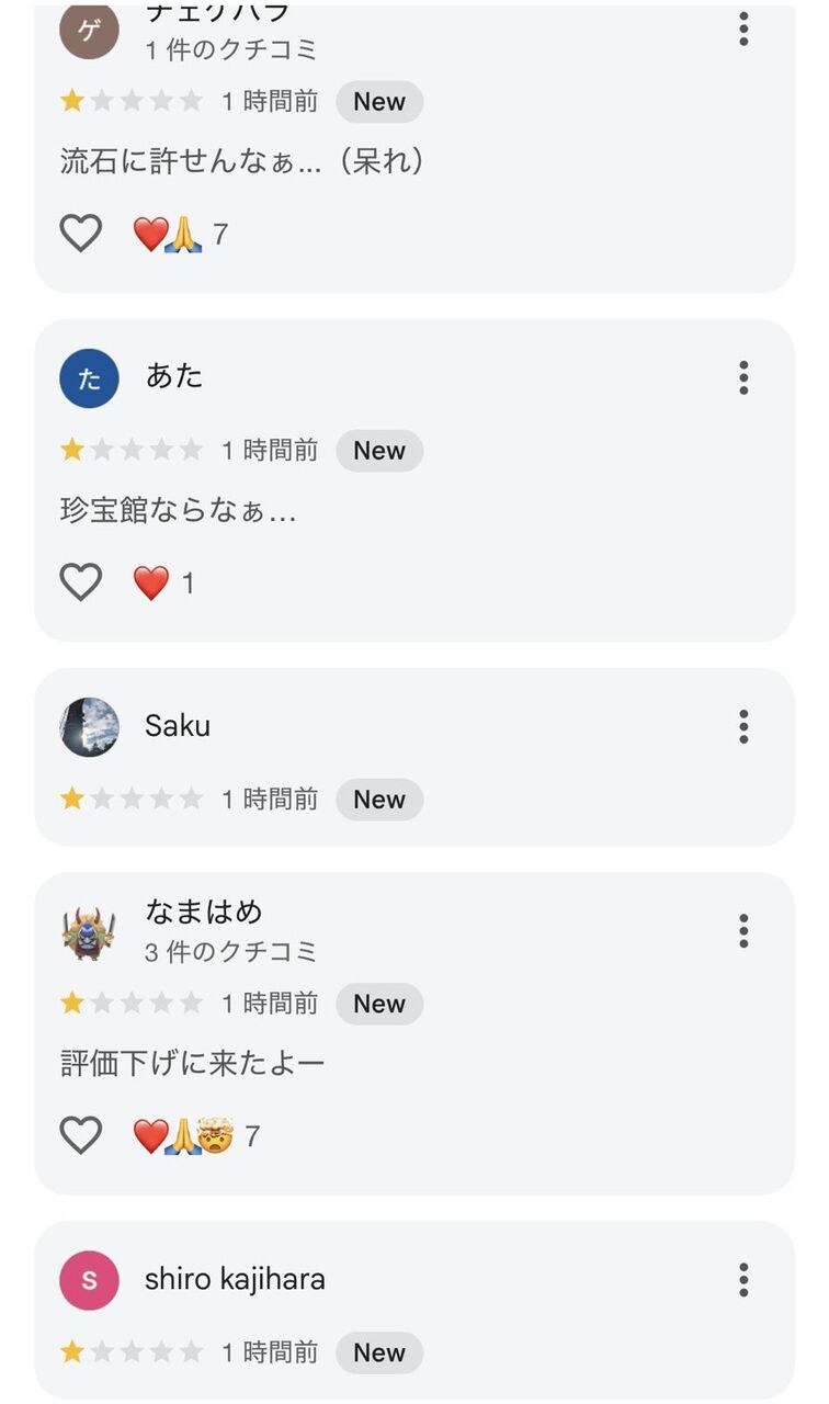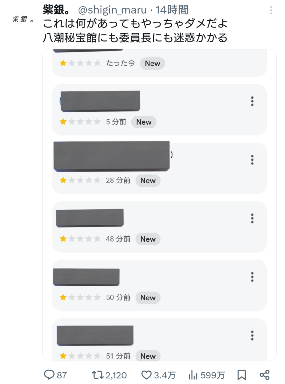 【悲報】バチャ豚さん、Vチューバーと揉めた八潮秘宝館に低評価爆撃 レビューの口コミを荒らしてしまう…… 2025/6/21 ゲーム実況者速報 " " 1: ゲーム実況者速報 2025/06/21(土) 08:35:16.65 ID:XuyTs9dH0 なんでこんな事するん? 続きを読む Source: ゲーム実況者速報