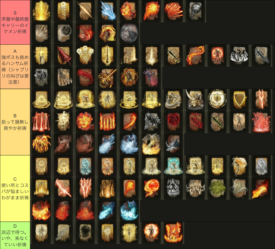 多分この中で一番強いというか、3日間通して火力貢献出来る祈祷は武器ガチャの安定性と遺物の噛み合いが頭1つ抜けてる雷槍か黒炎、石投げ、岩投げになると思う