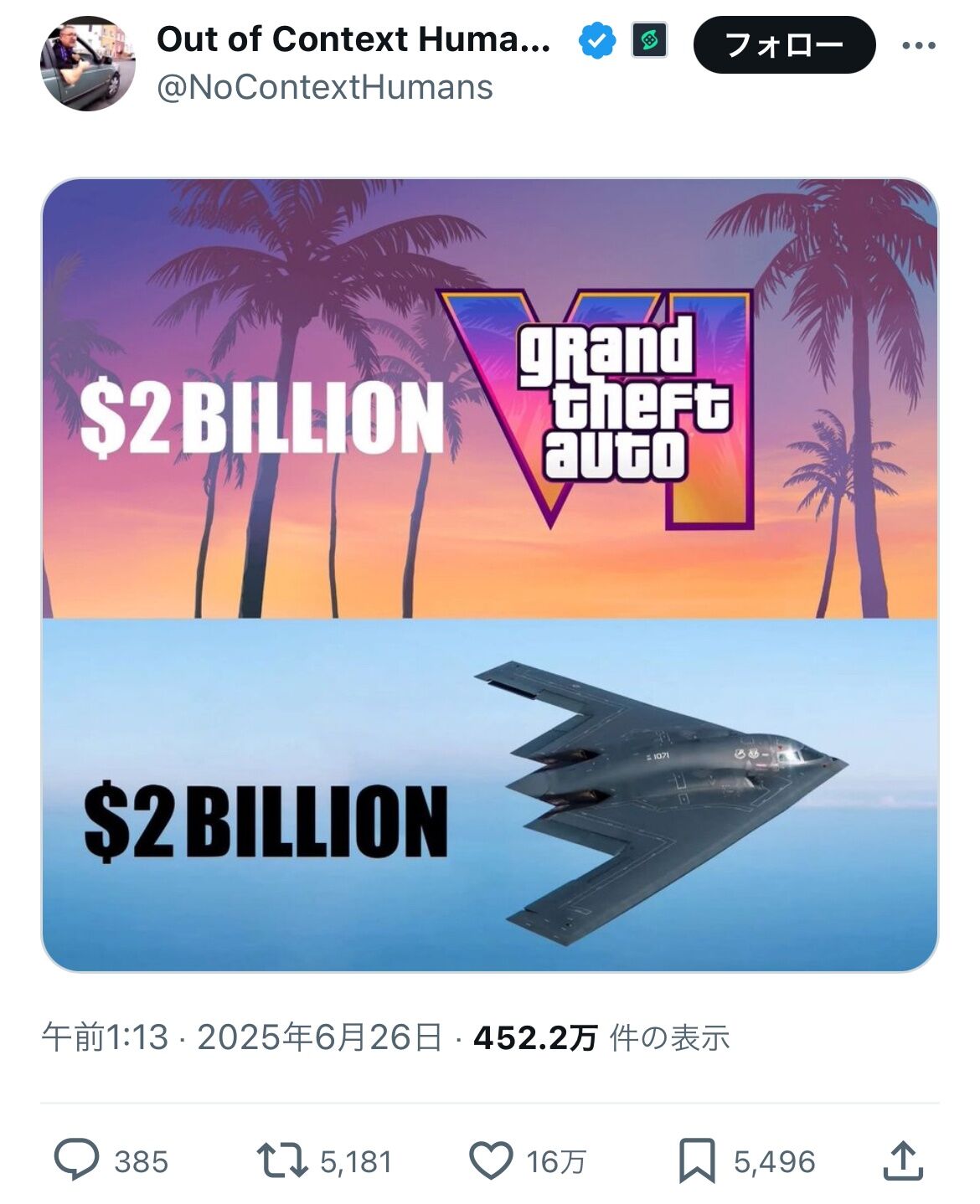 【悲報】『グランド・セフト・オートⅥ』の開発費、限界突破wwwwwwwwwwwwww 2025/6/27 Y速報 " " 1: 2025/06/26(木) 15:35:06.07 ID:bkT3D8QQ0 はい 続きを読む Source: Y速報