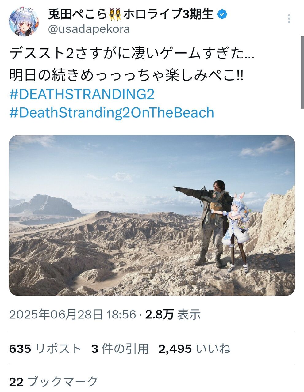 【朗報】超人気Vチューバーさん、デススト2を大絶賛!「スゴいゲームすぎた……」 2025/6/28 ゲーム実況者速報 " " 1: ゲーム実況者速報 2025/06/28(土) 19:19:36.097 ID:AjyEsLbX0 続きを読む Source: ゲーム実況者速報