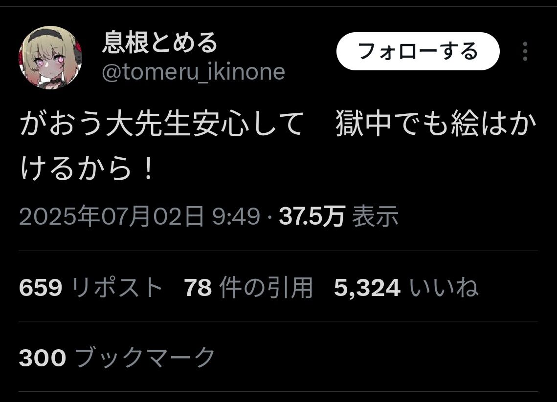 人気Vチューバー「がおう先生安心して、獄中でも絵は描けるからから!」→5000いいね 2025/7/3 ゲーム実況者速報 " " 1: ゲーム実況者速報 2025/07/03(木) 11:27:34.73 ID:cFIHjCrcd いかんでしょ 続きを読む Source: ゲーム実況者速報