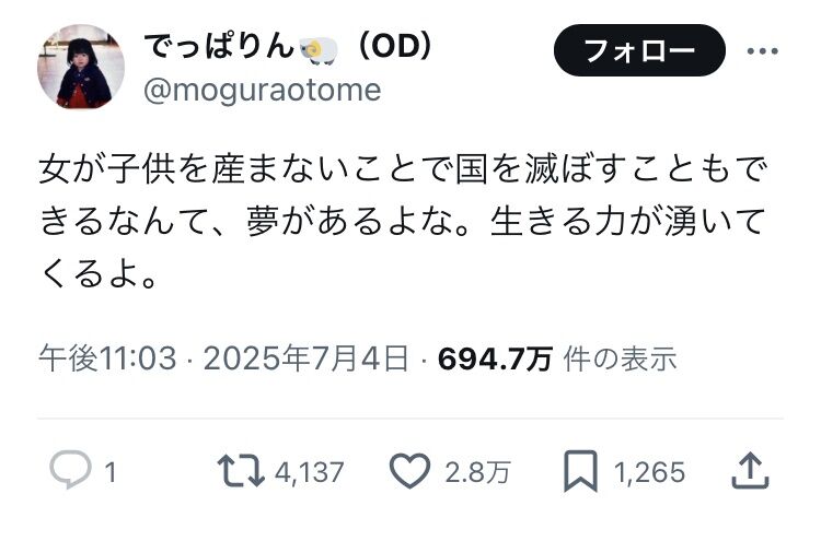 【悲報】女さん「私らが子どもを産まないことで国を滅ぼすことが出来るなんて、夢があるよな」 「男たちが動揺してて愉快」2.8万イイネwww 2025/7/7 Y速報 " " 1: 2025/07/07(月) 09:24:03.88 ID:9xL2mYsI00707 うへ 続きを読む Source: Y速報