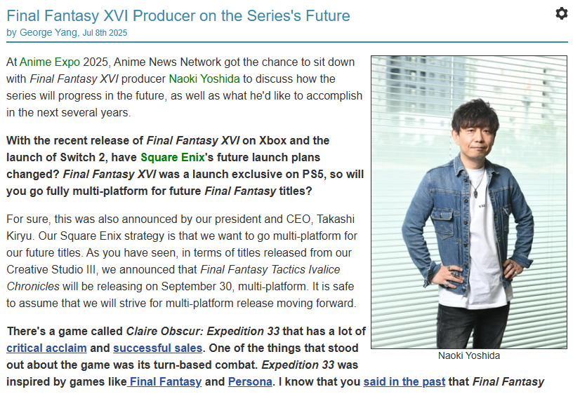 [I’m] not necessarily going to be on Final Fantasy 17, so we also don’t want to obstruct or limit our future director or whomever will be producing the games like 17 or even 18. We don’t want to put them on a rail.