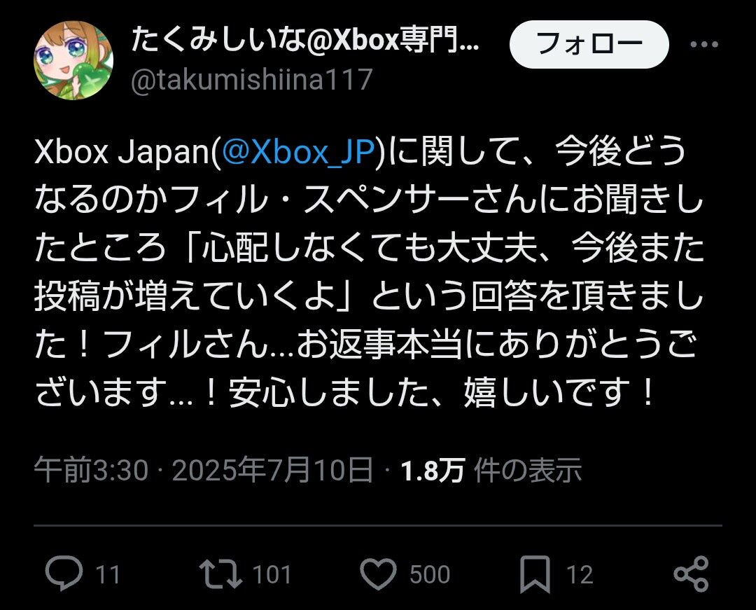 【朗報】フィル「Xbox Japanの活動が止まったのは心配しなくてもいい、また投稿が増えていくよ」 2025/7/14 Y速報 " " 1: 2025/07/10(木) 08:38:39.11 ID:+583A5Rd0 うへ 続きを読む Source: Y速報