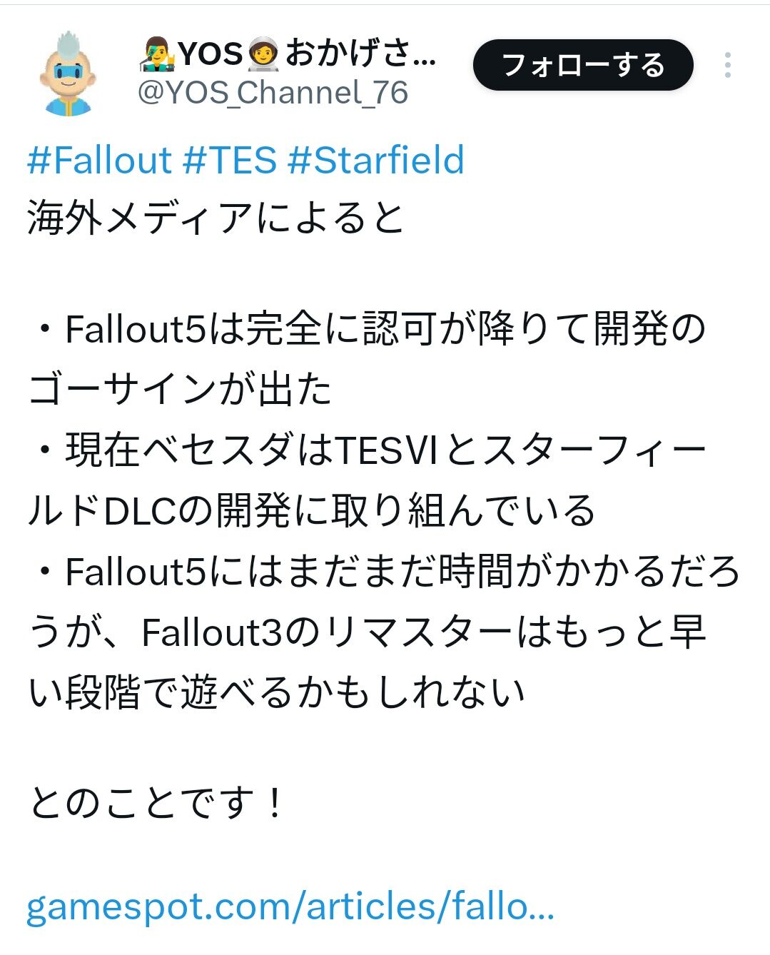 【朗報】ベセスダ「Fallout 5出すぜ!」信者「うおおおおお」ベセ「これから作るぜ!」 2025/7/16 Y速報 " " 1: 2025/07/16(水) 12:48:22.21 ID:M6tzCDQk0 信者「うおおおおお」 続きを読む Source: Y速報