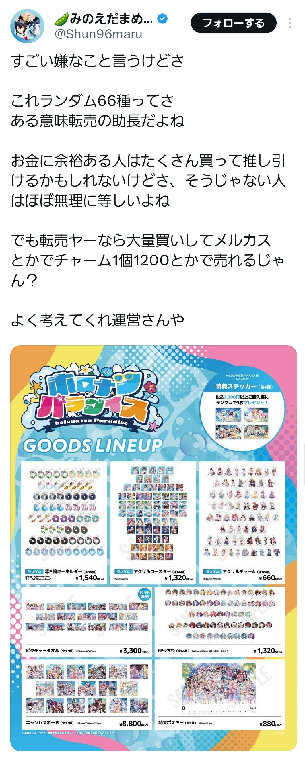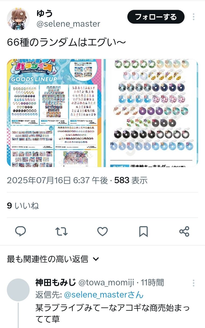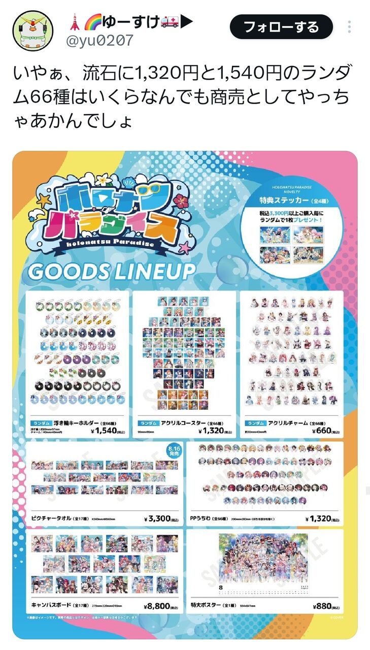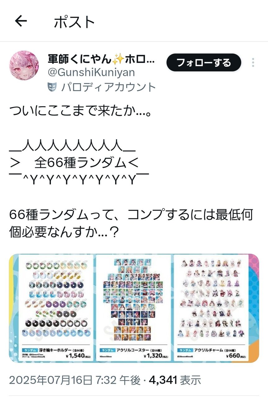 【ヤバい】一番手Vグループさん、エグすぎる商売を始めてしまう…… 2025/7/17 ゲーム実況者速報 " " 1: ゲーム実況者速報 2025/07/17(木) 07:58:03.582 ID:iEKp/wta0 66種類からランダムのグッズが一発1500円 続きを読む Source: ゲーム実況者速報