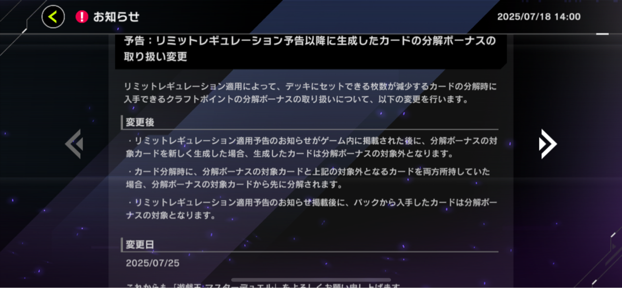 【予告】リミットレギュレーション予告以降に生成したカードの分解ボーナスの取り扱い変更 2025/7/18 遊戯王デュエルリンクス超速報! " " 続きを読む Source: 遊戯王デュエルリンクス超速報!