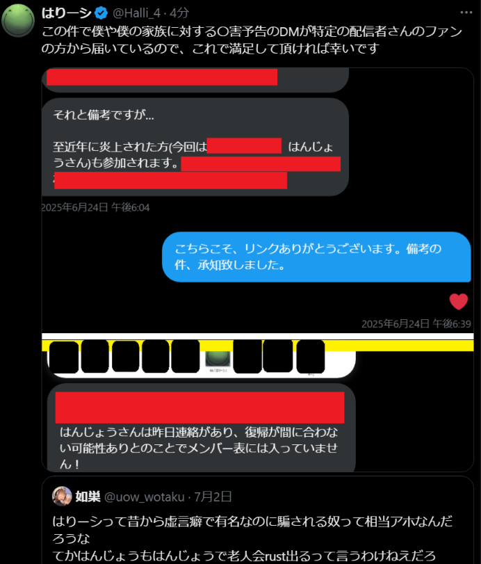 ※隠されている部分は「至近年に炎上された方(今回はみけねこさん はんじょうさん)」?